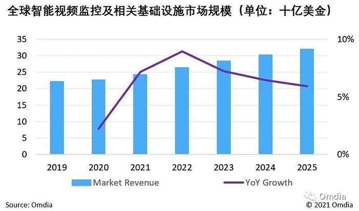 據(jù)Omdia最新研究數(shù)據(jù)顯示,全球智能視頻監(jiān)控及相關(guān)基礎(chǔ)設(shè)施市場規(guī)模將在2021年達(dá)到242億美金。隨著因2020年新冠疫情影響的需求回升,智能視頻監(jiān)控市場將在2021年快速恢復(fù)。Omdia預(yù)計(jì),到2025年全球智能視頻監(jiān)控及相關(guān)基礎(chǔ)設(shè)施市場規(guī)模將達(dá)319億美金,年復(fù)合增長達(dá)7.1%。